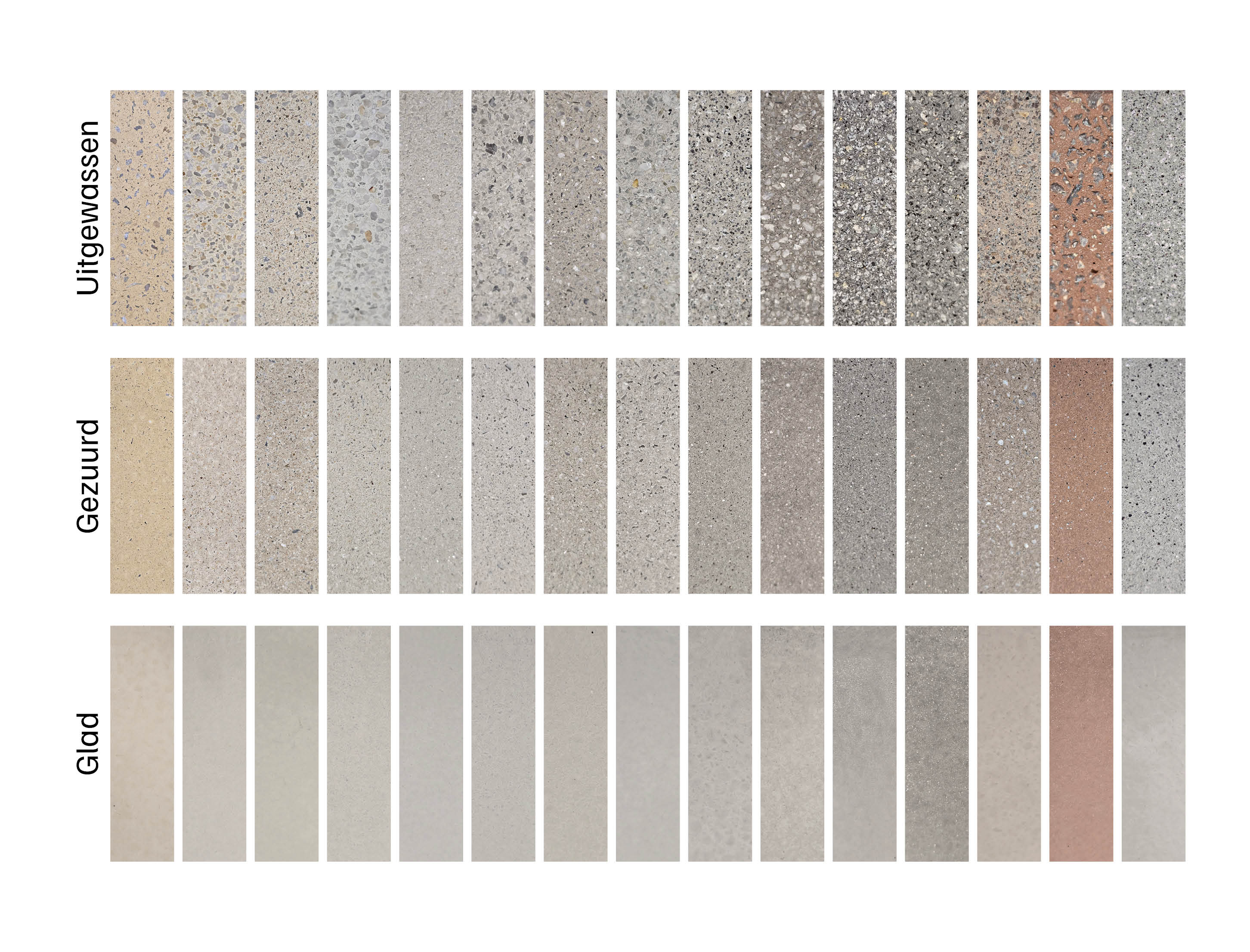 Architectonisch beton biedt ruime vrijheid op vlak van kleur, textuur en afwerking. Door het gebruik van verschillende siergranulaten en zanden, kleurpigmenten en andere toevoegingen is een zeer breed assortiment aan stalen mogelijk. Op aanvraag kan een staal op maat worden ontwikkeld, zodat het zitmeubilair perfect aansluit bij de omgeving en het ontwerpconcept.